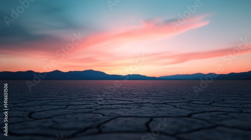 Vibrant sunset over cracked earth in a desert landscape with distant mountains and colorful sky hues