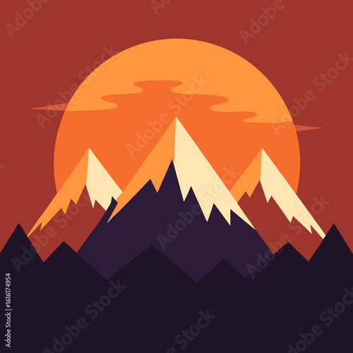 Vibrant sunset over jagged mountains in flat design style
