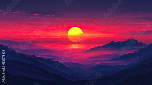 Vibrant sunset over misty mountains; birds fly