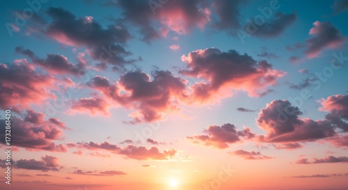 Vibrant sunset sky with fluffy clouds creating a peaceful atmospheric scene