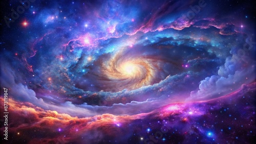 Vibrant, swirling clouds of purple, blue, and pink gas illuminate a stunning, star-filled galaxy in deep, starry space.