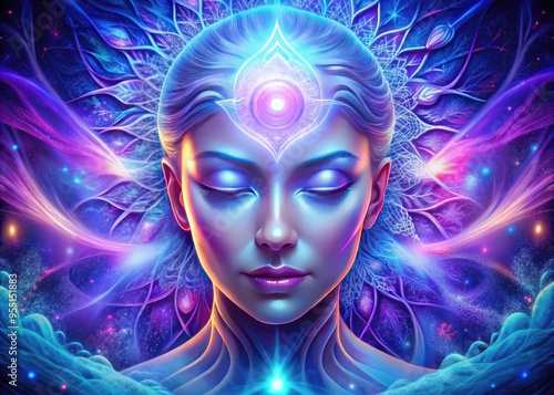 Vibrant, swirling purple and blue energy radiates from the center of a serene, meditative face, symbolizing intuition, wisdom, and spiritual connection to the third eye.