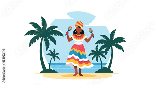 Vibrant Tropical Dance Celebration Featuring A Woman With Maracas And Palm Trees