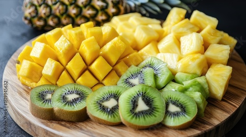 Vibrant Tropical Fruit Platter: Mango, Pineapple, and Kiwi Slices