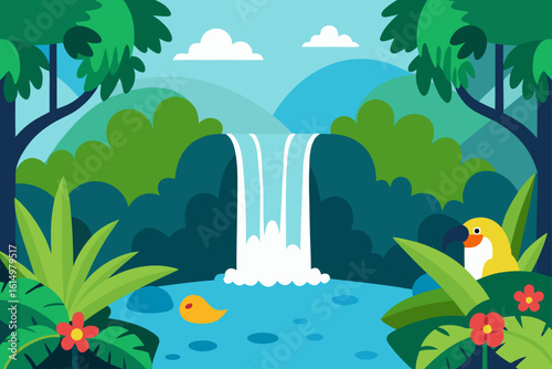 Vibrant tropical waterfall scene with birds and lush greenery