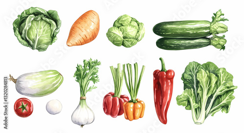 Vibrant Vegetable Assortment: A delightful arrangement of fresh, colorful vegetables including cabbage, carrot, cauliflower, zucchini, eggplant, onion, bell peppers, tomato, and lettuce.