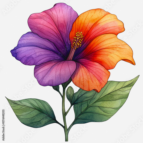 Vibrant Watercolor Flower Illustration Featuring Rich Purple and Orange Petals with Detailed Green Leaves on a Soft Neutral Background