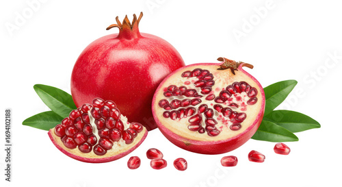 Vibrant whole and half red pomegranates, loose arils, green leaves on white background, bright soft studio light, sharp focus, copy space Concept of natural health and pure nutrition