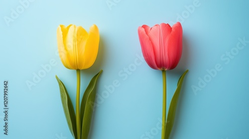 Vibrant yellow and pink tulips blooming gracefully, contrasting softly against pale blue background with delicate spring elegance