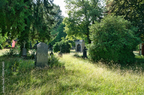 viele Grabsteine auf einer hohen Wiese auf einem Waldfriedhof in Memmingen