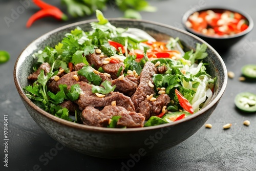 Vietnamese restaurant serving Bo bun beef bowl with fresh herbs
