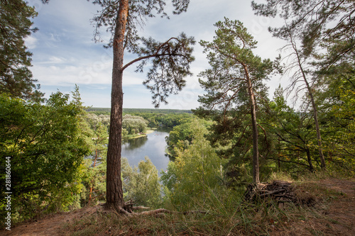 View from a hill covered with trees to a river