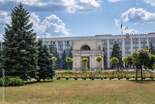 View from Cathedral Park on Triumphal Arch and Government House building in centre of Chisinau city, Moldova