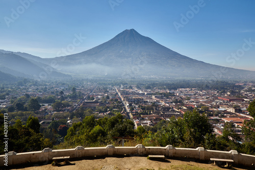 View of Antigua Guatemala. The view is clear. The volcano Agua is visible.