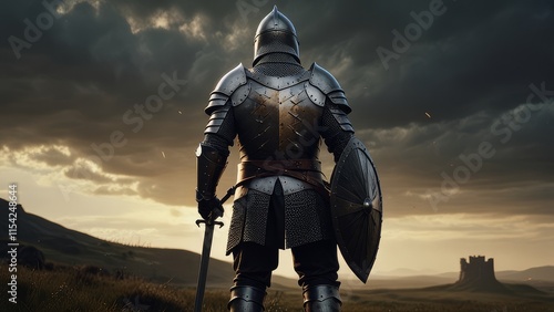 view of epic powerful medieval knight with sword and metal shield guardian warrior, mystic fantasy battle