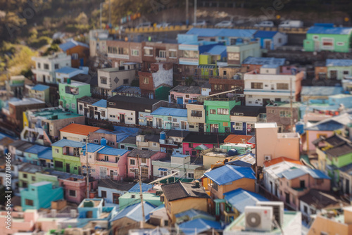 View of Gamcheon Culture village, Busan city, South Korea, Gamcheon-dong, Saha District, beautiful view of streets and multicoloured houses in a summer sunny day, Republic of Korea travel
