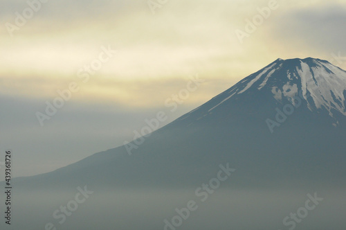 View of Mount Fuji at dusk, from the fumaroles in Mount Hakone, Hakone, Kanagawa Prefecture, Japan. The picture is in landscape view