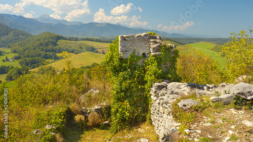 View of ruins of the former castel of Montousse with Pyrenees on bacground, France