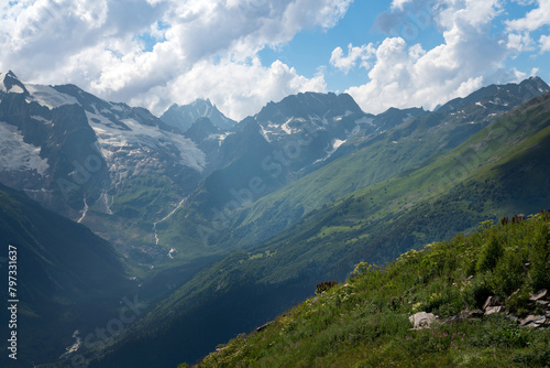 View of the Alibek Gorge, the Alibek River and the mountains of the Main Caucasian Ridge, opening from the upper station of the cable car system of the Dombay ski resort, Karachay-Cherkessia, Russia