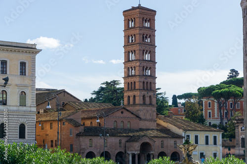 view of the Basilica of Saint Mary in Cosmedin (Italian: Basilica di Santa Maria in Cosmedin in Rome, Italy. In the portico of the church can be found La Bocca della Verità.