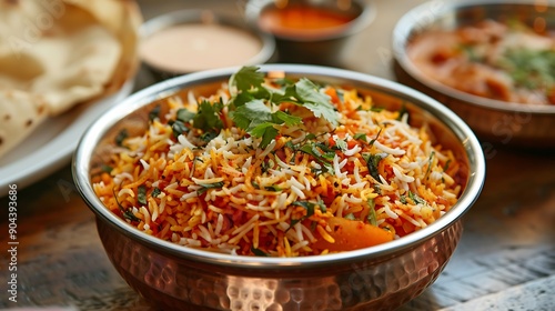 View of the biryani rice ketchup and papadam closer to home