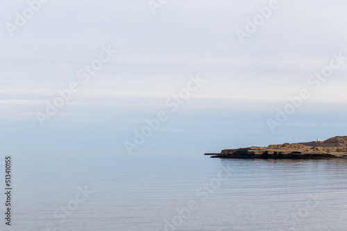 View of the calm Atlantic Ocean, blue sky and a small stone island. Peninsula Valdes, Patagonia, Argentina