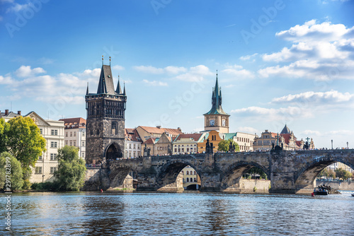 View of the city of Prague and the Charles Bridge and Vltava River.