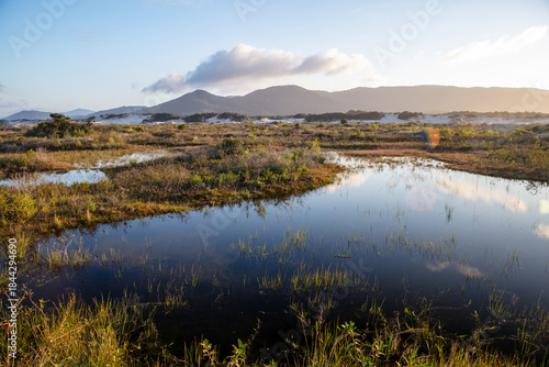 View of the Joaquina dunes at sunset, lagoons in the dunes and beach in the background on the island of Florianopolis, Santa Catarina, Brazil.