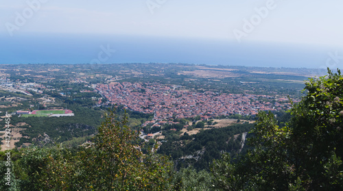 View of the mountain town of Litochoro from Mount Olympus in Greece.