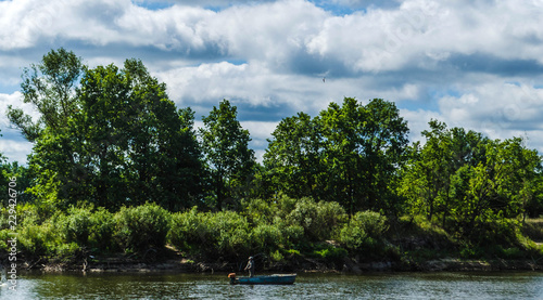 View of the river where a fisherman in a boat catches fish on a background of green trees and blue sky. Belarusian Polesie. Pripyat National Park
