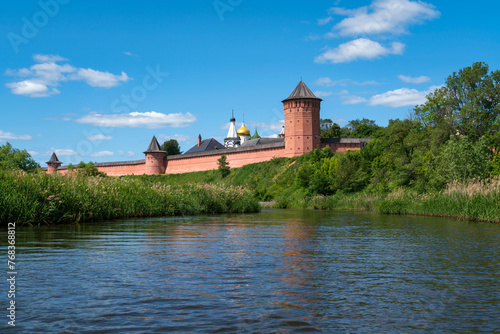 View of the Spaso-Evfimiev Monastery (a monastery of the Vladimir Diocese of the Russian Orthodox Church) on the bank of the Kamenka River on a sunny summer day, Suzdal, Vladimir region, Russia