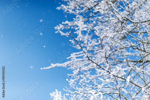 View to frozen top trees on blue sky background