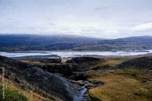 Views of the Logurinn river from the mountains, on an autumn day, with snowy forests and meadows, near the Litlanesfoss waterfall, in Iceland