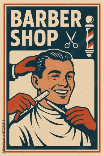 Vintage 1950s Barbershop Poster - Retro Haircut and Shave Illustration with Barber Pole and Scissors Icons