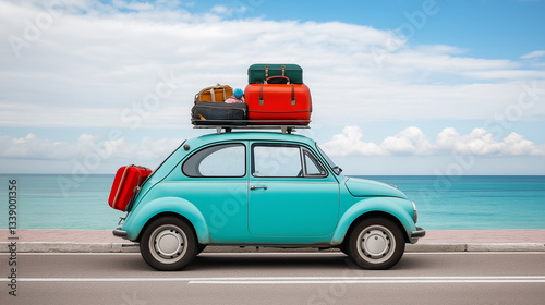 Vintage Car Packed with Luggage Parked Beside the Ocean.