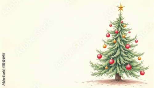 Vintage Christmas tree decorated with red and golden ornaments and star on light background for holiday card concept copy space