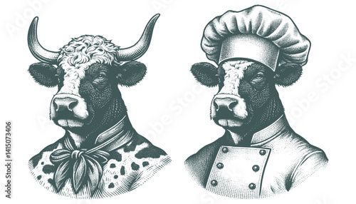 Vintage Cow Chef Illustration, Black and White Engraving Style