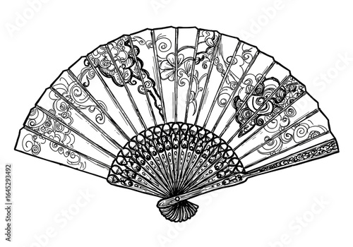 Vintage Hand Fan: Ornate Black and White Illustration isolated on transparent background
