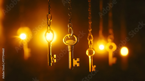 Vintage Keys Hanging Against a Warm Golden Light Background, Intricate Details and Soft Focus, Ideal for Creative Projects and Backgrounds