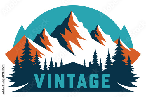 Vintage Mountain Landscape Silhouette with Pine Trees
