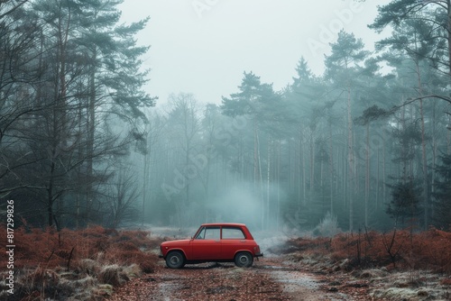 Vintage red car in a foggy forest. Landscape photography for poster and print.