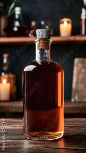 Vintage Rum Bottle on Rustic Wooden Table with Soft Candlelight