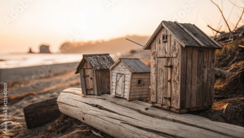 Vintage Sepia Sunset: Rustic Wooden Hangars, Ocean Hues, Coastal Charm