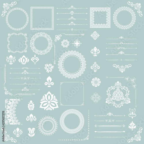 Vintage set of vector white horizontal, square and round elements. Different elements for backgrounds, frames and monograms. Classic patterns. Set of vintage patterns
