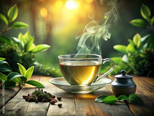 Vintage Style Photography of an Elegant Teacup with Steaming Green Tea Surrounded by Fresh Tea Leaves for Health and Wellness Product Advertisements