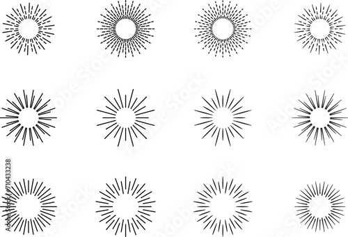 Vintage sunburst set. Bursting rays sunrise firework starburst blast, Radiant Spark. Vintage sunburst, Rays. Geometric Design Elements. Retro radiant sunburst, starburst hand drawn label, sun rays.