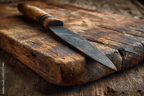 Vintage wooden cutting board with knife on a rustic wooden table bathed in warm natural light