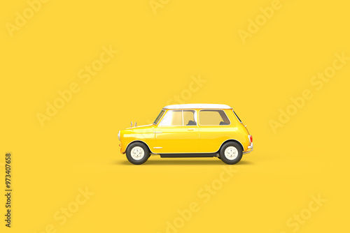 Vintage yellow car on a yellow background. 3d rendering on the topic of transport, car, spare parts, work, business, design. Minimal style. Side view.