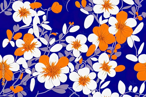 violet orange and mustered 2d illustrated flowers bunches with grey leaves pattern on blue background