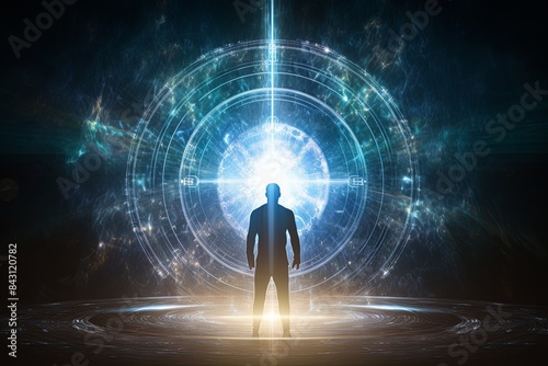 Virtual Enlightenment: Human Figure Embraced by Circuits and Light Rays